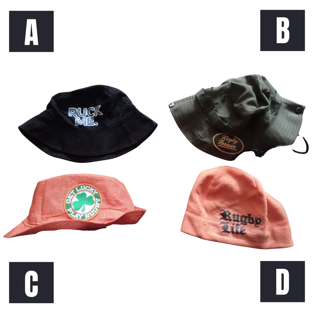 Sideline Find- make your selection from these lovely collections of unique rugby themed hats. These four hats are all perfect for your rugby life. Please designate the letter of the hat you seek in the option section.